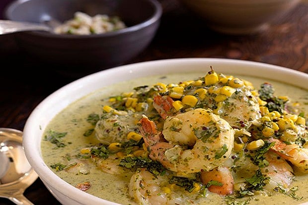 For the curry 3 tablespoons/45 ml canola oil 1 1/2 teaspoons cumin seeds 1 teaspoon brown mustard seeds 15 fresh or 22 frozen curry leaves, roughly chopped 3 dried red chiles 1/4 teaspoon ground turmeric 1/8 teaspoon asafetida 2 13.5-ounce/380 g cans coconut milk 1/2 cup/120 ml heavy cream, half-and-half, or milk 1 teaspoon kosher salt 4 cups/615 g fresh corn (from 4 to 6 ears) or frozen corn 2 pounds/907 g tiger shrimp (16 to 20 shrimp per pound), peeled and deveined 1/4 cup finely chopped fresh cilantro Place the curry leaves, ginger, lemongrass paste (if using), cilantro, jalapeno or serrano, and 3 tablespoons/45 ml water in the bowl of a food processor and puree into a nearly smooth paste.