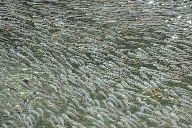 The mollies are prey for an array of winged predators, including egrets, kingfishers, and kiskadees. When birds dive to attack, the mollies flash and swirl.
