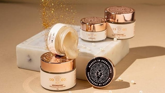BiE's Moongleam Precious Gel Cream is finished with precious gold and silver leaf, diamond dust, and pearl protein, making it an ultra-luxe cream. It acts as a dual-benefit primer and moisturiser that imparts radiance, increases elasticity, and leaves skin with a dewy, golden sheen.