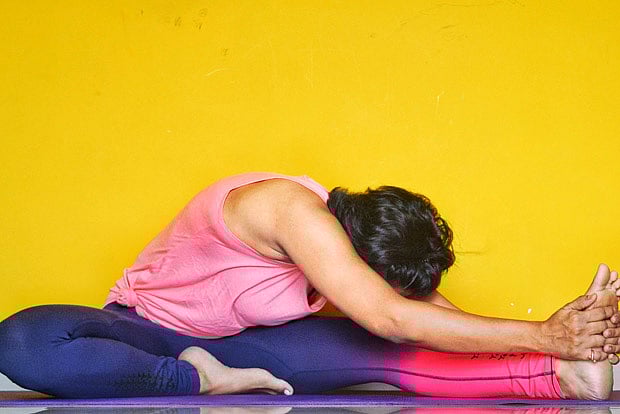 Bring both legs outstretched for a forward bend. Lengthen the spine in a seated position before coming forward. Imagine the pelvis as a bowl that is tipping forward as you come down. The seated forward bend - paschimottanasana - goes deeper still in opening the hamstrings and calves. It also gives your back a nice stretch.