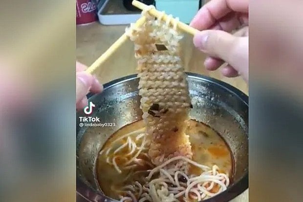 The video features a woman knitting a scarf not with wool but noodles. In this 8-second clip, you can see that the woman is using chopsticks as a needle and is weaving a scarf of some loops on it.