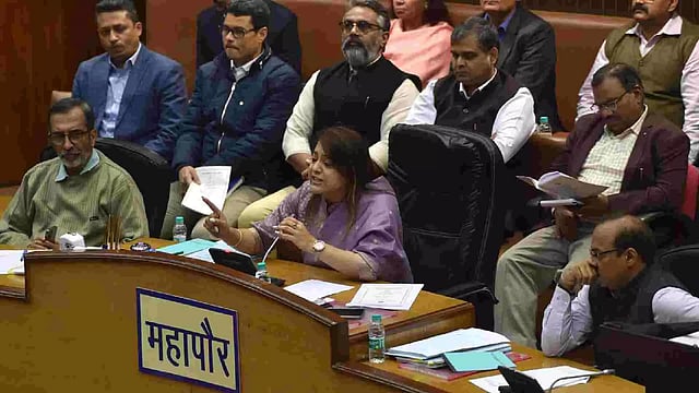 AAP councillors stood guards at Delhi mayor Shelly Oberoi's podium as she announced the budget, with their BJP and Congress counterparts surrounding it. The house could function for no more than five minutes as Oberoi read the budget above shouts of accusations and hurried out.