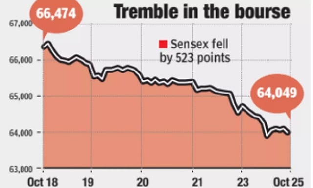 Falling for the fifth day running, the 30-share BSE Sensex tanked 522.82 points, or 0.81 per cent, to settle at 64,049.06. In five days, the BSE benchmark has plunged 2,379.03 points, or 3.58 per cent. The market capitalisation of BSE-listed companies eroded by Rs 14,60,288.82 crore to Rs 3,09,22,136.31 crore in five days.
