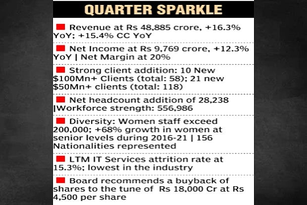 TCS, which hit the $25 billion revenue mark in calendar year 2021, registered Rs 48,885 crore in revenues for the quarter, up 16.3 pc year-on-year (YoY) and Rs 9,769 crore in net profit, a 12.3 pc YoY growth. Total contract value for the quarter stood at $7.6 billion, up 12 pc from Q3 FY21.