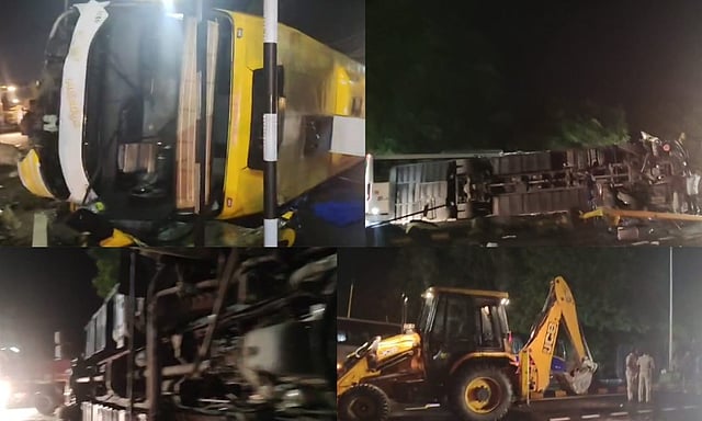 According to reports, the earthmover was attempting to cross the road in a hurry when the speeding bus crashed into it, causing the vehicle to overturn.