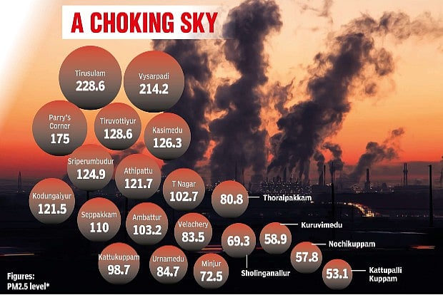 The report said air quality in Chennai in February-March 2021 was consistently poor. “Seventeen of the 20 air samples substantially exceeded the 24-hour NAAQS for PM2.5 of 60 µg/m3 by 1.1 to 3.8 times,” it said, adding that samples collected from Kuruvimedu, Nochikuppam, and Kattupalli Kuppam did not exceed the 24-hour NAAQS for PM2.5 while Tirusulam (228.6µg/m3), Vyasarpadi (214.2µg/m3) and Parry’s Corner (175µg/m3) had the highest levels.