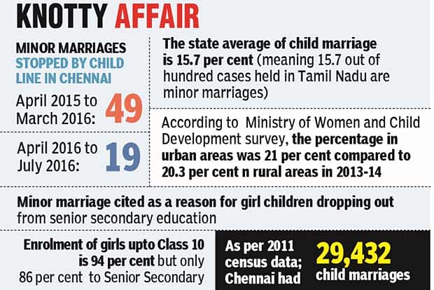 The Ministry of Women and Child Development says the percentage of child marriage in urban areas are more, when compared to rural areas. The actual number of married minor girls in Chennai could be much higher, say sources in Child Line, adding they are in a position to intervene only when they get information regarding such marriages. UNICEF personnel who work among victims of child marriages and their families say that in Chennai, poverty was never highlighted as an issue in child marriages.