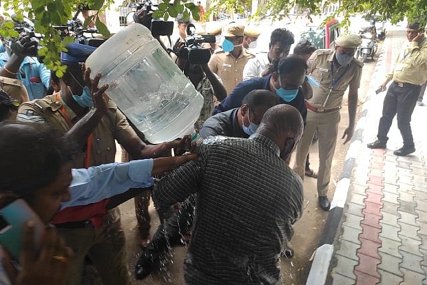 The man has been identified as Murugan, who entered the Assembly premises masquerading as a journalist, poured petrol on his body and was about to light a matchstick when an alert Marshal foiled his alleged suicide attempt. The police immediately took him into custody.