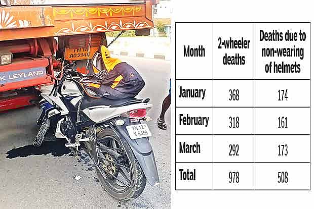 According to the report titled “Road Accident Analysis in Tamil Nadu March 2019”, out of the 978 persons killed in the accidents involving two-wheelers, 508 riders and pillion riders did not wear a helmet. “About 52 per cent of the death in two-wheelers were occurred due to non-wearing of helmets,” it said.