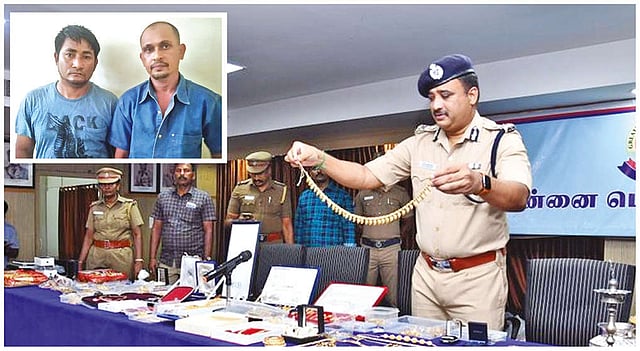 CHENNAI: After cracking the double murder case reported in Mylapore within six hours and arresting the suspects near Ongole in Andhra Pradesh, the city police on Sunday informed that they have seized about eight kg of gold and diamond jewels worth over Rs 5 crore, silver articles and the car of the victims in which the suspects fled.