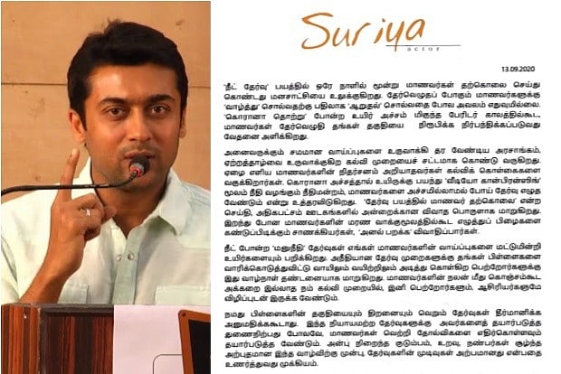 Suriya further said while the Court of law and the lawmakers opt for video conferencing, it's pathetic to see them direct the students to attend the exams in person. He criticized the media too, for politicising the unfortunate deaths of the students, who met the tragic end due to the "NEET" fear factor.