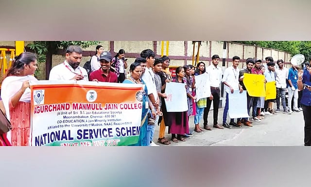 CHENNAI: To create awareness on the International Day against drugs abuse and illicit trafficking, students of Agurchand Manmull Jain College, Chennai, participated in a campaign at Tirusulam signal near Chennai airport.