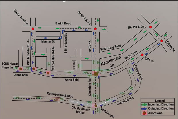 A trial run for two-way traffic with modifications was conducted on Friday by the city traffic police and after the positive feedback from motorists, the authorities have decided to make the traffic changes permanent. At Nandanam junction, the vehicles plying on Anna Salai from Saidapet will be allowed straight towards Teynampet, towards Chamiers Road on the right and the left-turn has towards Venkat Narayana Road has been made free-left. There will be no change in the movement of vehicles on Anna Salai from Teynampet towards Saidapet. At Nandanam junction, the vehicles plying on Chamiers Road will be allowed straight towards Venkat Narayana Road, towards Anna Salai-Teynampet on the right and the turn towards Saidapet has been made free-left. Similarly, at Nandanam Junction, the vehicles plying on Venkat Narayana Road will be allowed straight towards Chamiers, towards Anna Salai–Saidapet on the right and the turn towards Anna Salai-Teynampet has been made free-left.