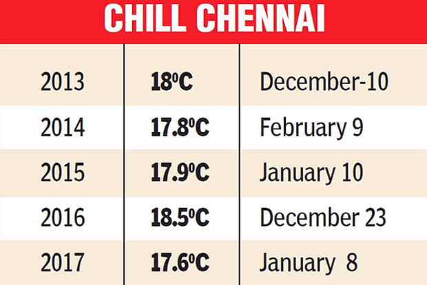 According to weathermen, Chennai and most parts of the state have been recording temperatures which stay slightly below normal. While Sunday morning witnessed was 19 degrees Celsius, it dipped to 17.6 degree before sun rise on Monday. They also said that the city recorded 17.9 and 17.8 degree Celsius in 2015 and 2014 respectively. Speaking to Dt Next, S Balachandran, director of Area Cyclone Warning Centre, RMC, admitted that the last three days saw steady dip in the temperature during early mornings.