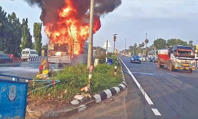 CHENNAI: A private electric bus gutted in fire on the Chennai-Bangalore Highway near Chembarambakkam on Friday. Luckily no casualties were reported.