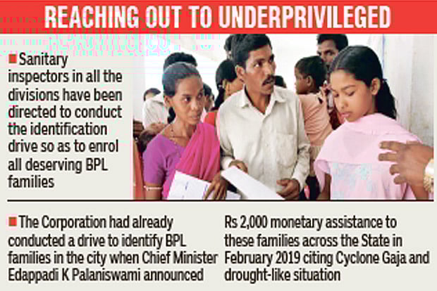 The Corporation had already conducted a drive to identify BPL families in the city when Chief Minister Edappadi K Palaniswami announced Rs 2,000 monetary assistance to these families across the State in February 2019 citing Cyclone Gaja and drought-like situation.“Most of the BPL families have already been identified. Now we must verify the detailed collected, apart from finding out the families that were missed out,” the official added.