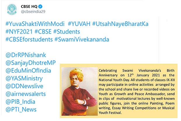 The circular on the National Youth Parliament Festival 2021 and National Youth Festival 2021 virtually attended by the Prime Minister, had also urged CBSE schools to popularise the three hashtags #YuvaShaktiWithModi, #YUVAH#UtsahNayeBharatKa, #NYF2021 besides encouraging their students to listen to the Prime Minister.