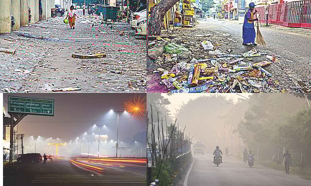 Despite the TNPCB’s directive to burst crackers only from 6 am to 7 am and from 7 pm to 8 pm on Deepavali, many residents began the fireworks as early as Wednesday, leaving a thick layer of smog over the city. The air quality further plummeted on the day of festivities on Thursday.