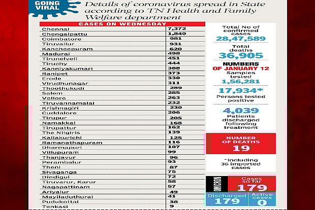 A total of 19 deaths were reported in TN, taking the total to 36,905. At least 4,039 patients were discharged.