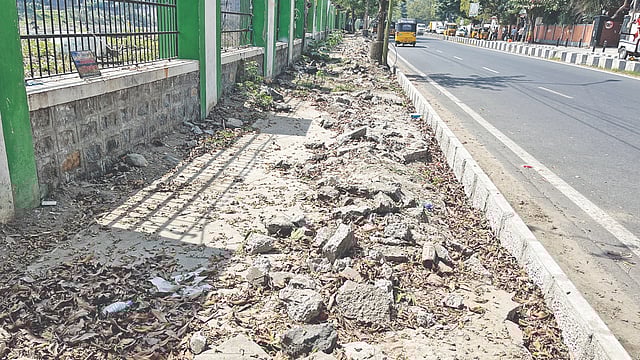 Similarly, the 550-meter pavement alongside the Mayor Ramanathan Salai (Spurtank Road) was filled with unremoved concrete slabs for over a month, forcing pedestrians to walk on the road.