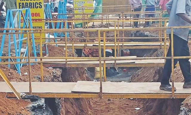 Large sections of the road have been excavated for a 10–12 ft deep pipeline trench. "Sales have dropped because customers can't park," a textile shop owner on MC Road said. “Customers who usually arrive by two-wheelers and small goods vehicles are staying away.”