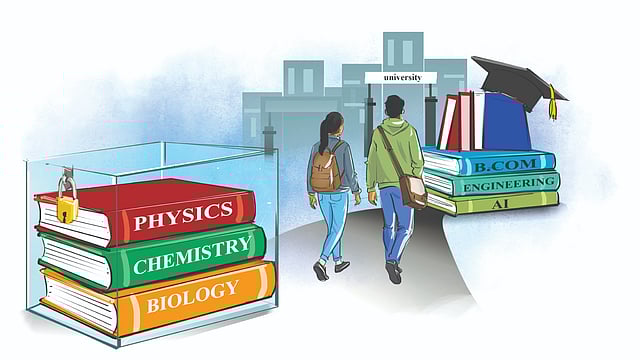 Speaking to DT Next, a woman professor of a college where the maths department was shut down expressed concern over the surge in interest in commerce-related courses such as BCom. “Science subjects are often perceived as difficult, which discourages enrolment,” she stated. “At the school level, students are frequently guided toward medicine and engineering, while UG pure-science courses are wrongly portrayed as offering limited career growth.”
