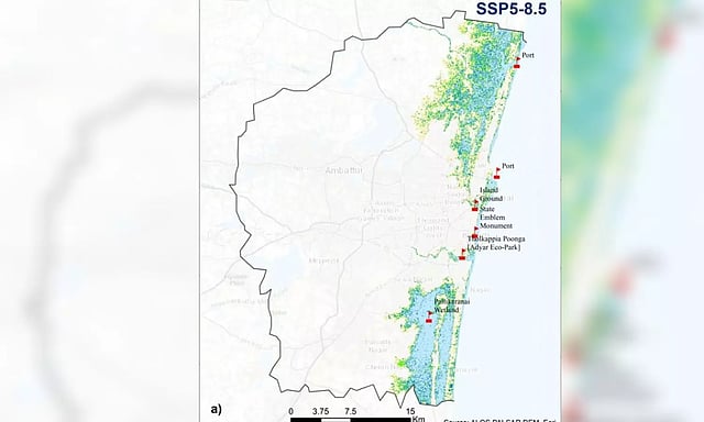 According to the 'Sea Level Rise Scenarios and Inundation Maps for Selected Indian Coastal Cities' report released by CSTEP, the sea level in Chennai would rise by 94.7 cm by 2100 under the high-emission scenario (known among experts and scientists as SSP5-8.5).
