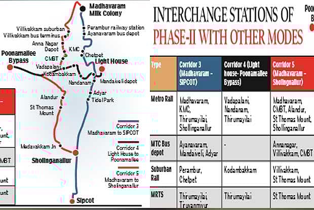Three corridors - Madhavaram to SIPCOT near Siruseri (45.8 km), Lighthouse to Poonamallee Bypass (26.1 km) and Madhavaram to Sholinganallur (47 km)- running a total distance of 118.9 km will provide commuters 25 interchanging stations with an option to change between two metro corridors, MRTS, suburban train services and MTC bus depots.