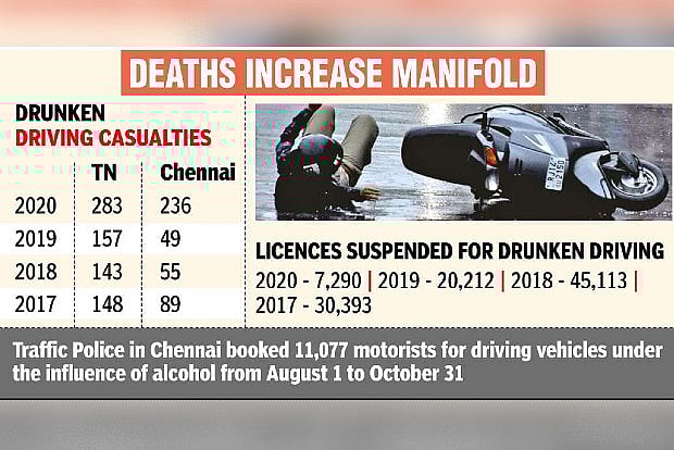 One in four traffic fatalities in Chennai, which recorded the second-highest number of traffic fatalities among the cities in 2020, was due to driving under the influence of drugs/alcohol.