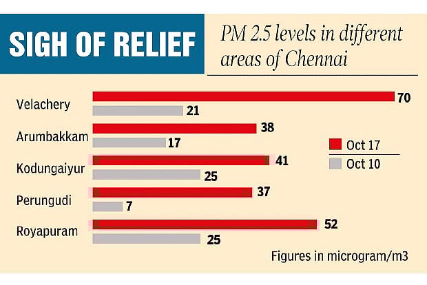 According to the Central Pollution Control Board (CPCB), the air quality levels in the city were mostly within the permissible limits of 100 microgram/m3. While the PM 2.5 level in Arumbakkam was 38 microgram/m3, Kodungaiyur marked 41 microgram/m3; Perungudi, 37 microgram/m3; and Royapuram, 52 microgram/m3.