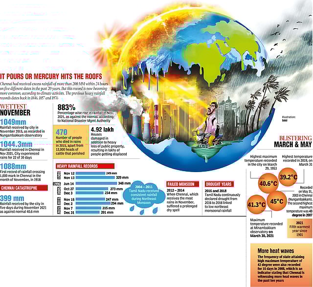 The extreme weather conditions being witnessed in the State — be it the rising maximum temperatures, cyclonic disturbances, or extreme rainfall — are a result of climate change, say experts. In the case of the metropolis itself, since the catastrophic Chennai floods in December 2015, the city has had several other extreme weather conditions. A few months ago, in November 2021, the whole city of Chennai was waterlogged with heavy rains, which even claimed 14 lives. Flagging the human fingerprint, environmentalists and weather experts point to the loss of green cover, pollution, and poor maintenance of water bodies as major reasons that have contributed to climate change.