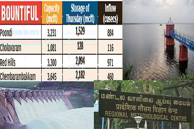 Poondi lake had 1,529 mcft against its full capacity of 3,231 mcft. Cholavaram lake (full capacity 1,081 mcft) had 128 mcft and Red Hills lake (full capacity 3,300 mcft) had 2,094 mcft. Chembarambakkam lake had 2,182 mcft of water against its full capacity of 3,645 mcft. According to Regional Meteorological Centre data, Red Hills received 13 cm of rainfall during the 24 hours till Thursday 8.30 am. Poondi and Cholavaram received 5 cm rainfall each. On Wednesday, the lakes had a combined storage of 5,808 mcft with Red Hills lake receiving 160 cusecs and Cholavaram lake without any considerable inflow. On October 29, 2019, the lakes had a combined storage of 2,325 mcft of water only.