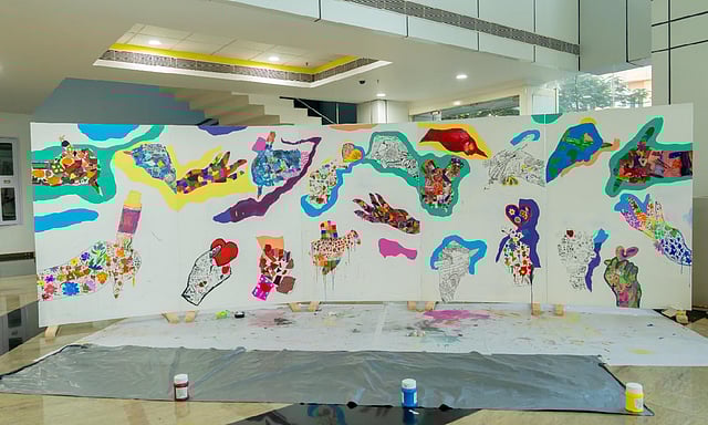 The huge blank canvas has several hands drawn with diverse posture depicting writing, helping and praying, which is being filled with painting, doodling, poetry and more, all representative of the community.