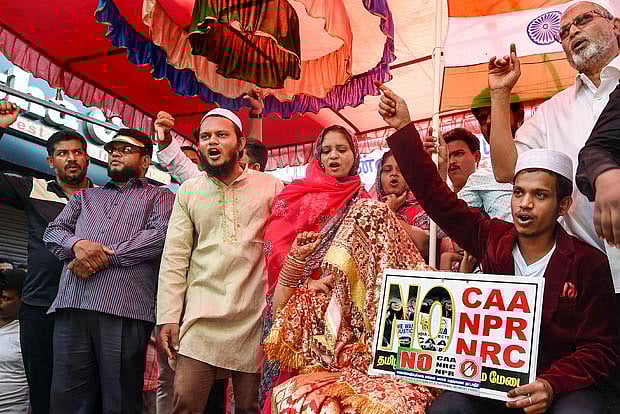 It was an unconventional way to celebrate convention at the Chennai’s Shaheen Bagh like protest at Washermenpet. A young Muslim couple tied the nuptial knot amid anti-CAA, NPR and NRC posters and the sound of protesters chanting near the Washermenpet Roundtana on Monday.
