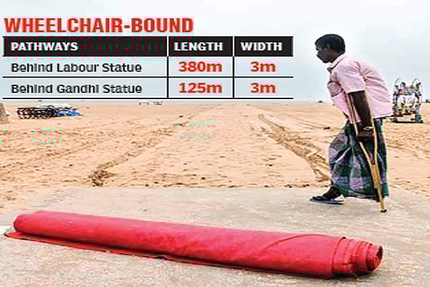 A Chennai Corporation official said that the clearance was accorded during a recent Central CRZ committee meeting. “As per the proposal, the walkways for the differently-abled persons would come behind the Labour Statue and Gandhi Statue. Using the facilities, differently-abled persons can use their wheelchairs to reach the tideline. As of now, moving wheelchairs on beach sand is virtually impossible,” the official said.