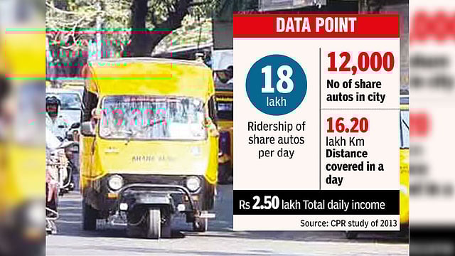 Research done by the Centre of Public Policy Research (CPR) in 2013 revealed that more than 18 lakh commuters use share autos every day which is second to MTC’s ridership. As the city has less than 3,500 MTC buses, the research estimated 12,000 share autos plying across the city making more than 2.50 lakh trips daily. The study also pointed out that the share autos cover a total distance of 16.20 lakh kilometres every day.