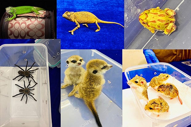 The Wild Life Crime Control Bureau (WCCB) officials identified the species as meerkat (suricata suricata), a carnivore of mongoose family native to Kalahari Desert and Angola; fat-tailed gerbil (pachyuromys duprasi) native of Northen Sahara; sphynx rat (rattus norvegicus) native to Africa; albino pacman frog (ceratophrys) native of South America; tarantula native to Africa; green iguana and chameleon native to Northern Mexico.