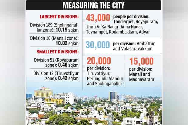 Zones such as Tondiarpet, Royapuram, Thiru Vi Ka Nagar, Anna Nagar, Teynampet, Kodambakkam, Adyar (all in the core city) would have a population of 43,000 per division. Divisions in Ambattur and Valasaravakkam zones would have a population of 30,000 and Tiruvottiyur, Perungudi, Alandur and Sholinganallur would have 20,000 people per division. Divisions in Manali and Madhavaram zones would have a population of 15,000.
