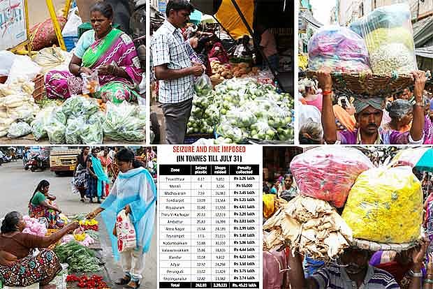 Since June 24, the day the civic body started to levy penalty, the Greater Chennai Corporation has collected more than Rs 45.21 lakh penalty from traders till July 31. During this period, ward-level teams had raided 2,39,121 shops in 15 zones and seized more than 262 tonnes of banned plastic items. About one-fifth of the seizure (52 tonnes) was from Kodambakkam zone alone, under which falls the shopping hub, T Nagar.