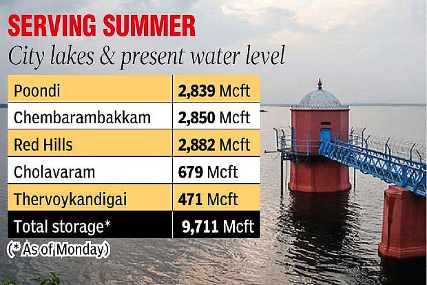 According to Chennai Metropolitan Water Supply and Sewerage Board (Metrowater) data, Poondi, Cholavaram, Red Hills, Thervoykandigai and Chembarambakkam lakes had total storage of 9,711 Mcft on Monday. This is despite the water being released from Poondi lake at more than 1,000 cusecs.