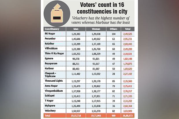 According to a press release issued by the Corporation, Velachery constituency has the highest number voters with 3,03,909 voters among the 16 constituencies in the district, whereas Harbour constituency has the least number of voters – 1,69,620. RK Nagar constituency has the highest number of transgender voters with 104 voters, while Chepauk–Triplicane constituency has the least – only 28 transgender voters among total voters of 2,27,102, the release said.