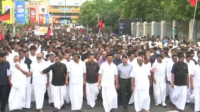 CHENNAI: Leaders of the ruling DMK led by its president cum Chief Minister M K Stalin on Sunday took out a peace rally from Omandurar estate to Marina on the fourth death anniversary of its former president M Karunanidhi.
