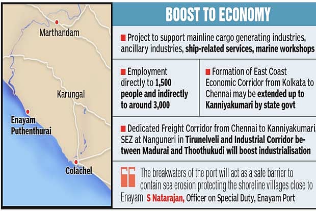 The shoreline between Enayam and Colachel —around 6km — was investigated by National Centre for Sustainable Coastal Management, Anna University, and the team zeroed in on Enayam. The breakwaters of the port will act as a safe barrier to contain sea erosion protecting the shoreline villages close to Enayam. Further, the port project would be executed in a way that the coastal villages are not affected.