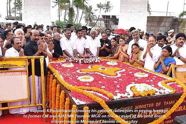 Chief Minister and AIADMK joint coordinator Edappadi K Palaniswami, AIADMK coordinator and Deputy Chief Minister O Panneerselvam along with state Ministers paid floral tributes at the Anna Square in Marina. AIADMK cadres from different parts of the state thronged in large numbers and paid homage. The MGR memorial was decked up by the Public Works Department and barricades were placed to regulate the visitors visiting the memorial.