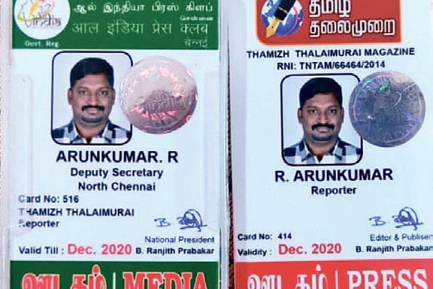 A team rushed to the spot and conducted inquiries before securing the accused identified as R Arunkumar (32) of Kodungaiyur and A Shyam (32) of Kodungaiyur. Police said a fake journalist ID card was seized from Arunkumar while the accused Shyam is employed in welding machine unit in Irunkattukottai. They were remanded in judicial custody.