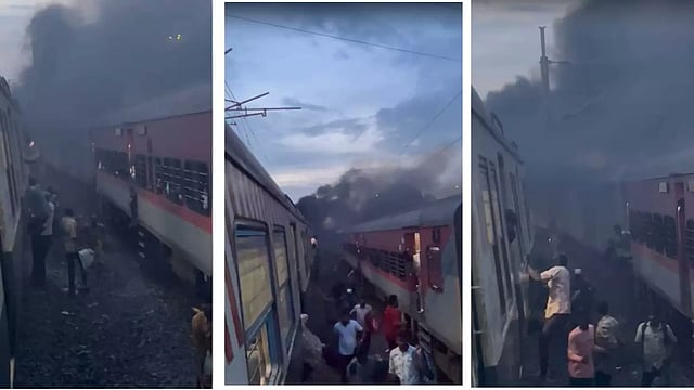 Passengers, who caught a glimpse of the smoke and fire emanating from the train halted a few minutes after its departure, were seen jumping out of the coaches and rushing to the rear.