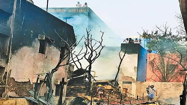 A blaze suddenly emerged from the polythene bags godown, owned by Balraj of Nethaji Nagar, Tondiarpet Saturday afternoon. More than 10 female employees who were working there ran amok screaming as a plume smoke came out of the godown. By then, the fire had spread to the nearby broom godown and silverware manufacturing company, owned by Zakir and also the nearby houses.
