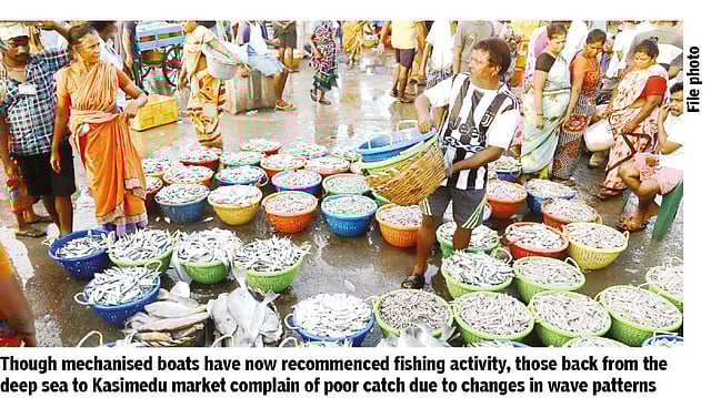 “Usually, the mechanised boats bring in over 60 tonnes of fish after the annual ban. Now we are able to catch less than 10 tonnes only since the sea is witnessing a change in the wave patterns for over a month,” said M Rajan, a fisherman and wholesale trader at Kasimedu fishing harbour.