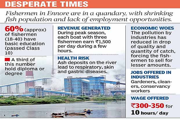 The dwindling fish population has hit the livelihood of local fishermen, who find it hard to sell their catch due to the poor quality. This has forced many fishermen to look for employment opportunities in nearby industrial units.