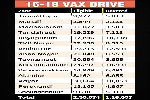 In just one week after the government started vaccinating children between the age of 15 to 18 years, the Greater Chennai Corporation (GCC) covered nearly half of the eligible child population in the city with the first doses of the COVID-19 vaccine.